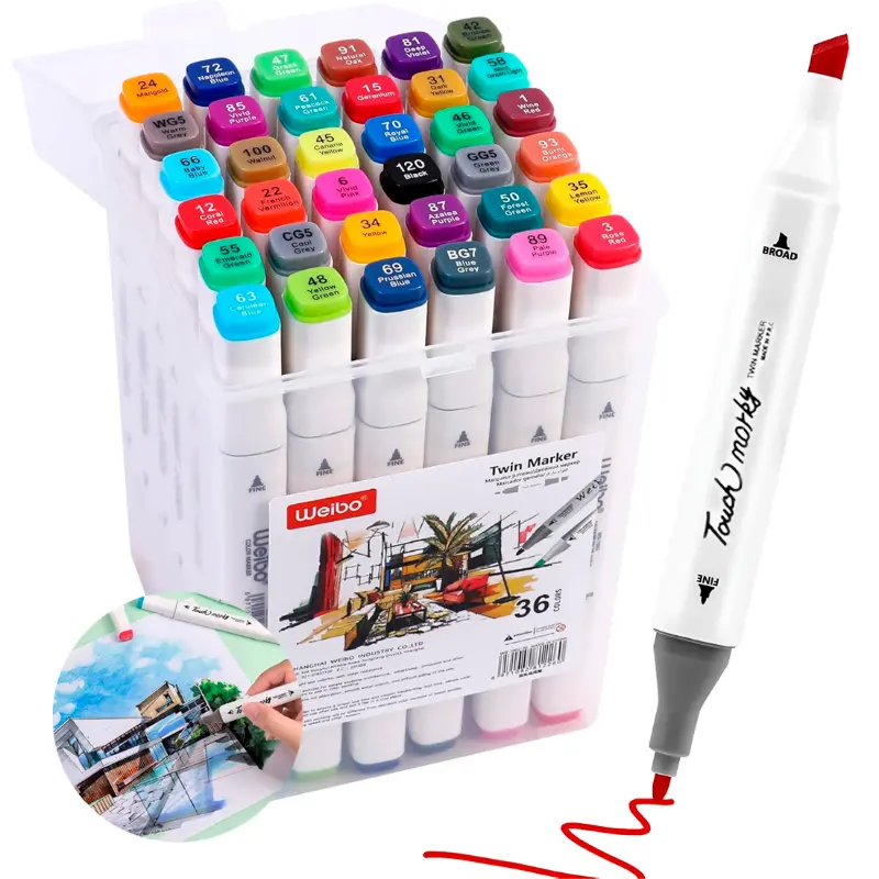 SET DE 36 MARCADORES PROFESIONALES WEIBO TWIN MARKER PUNTA DOBLE